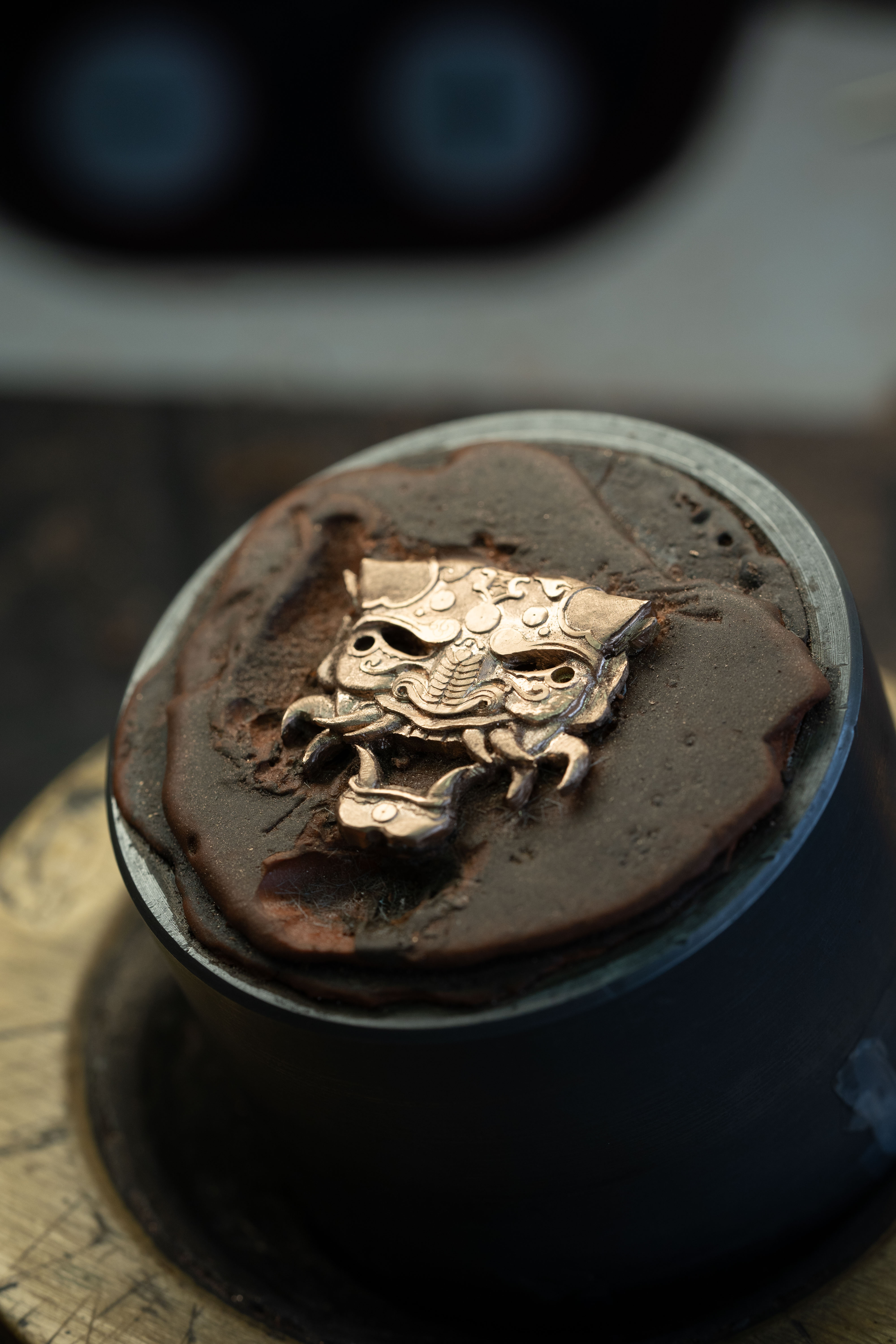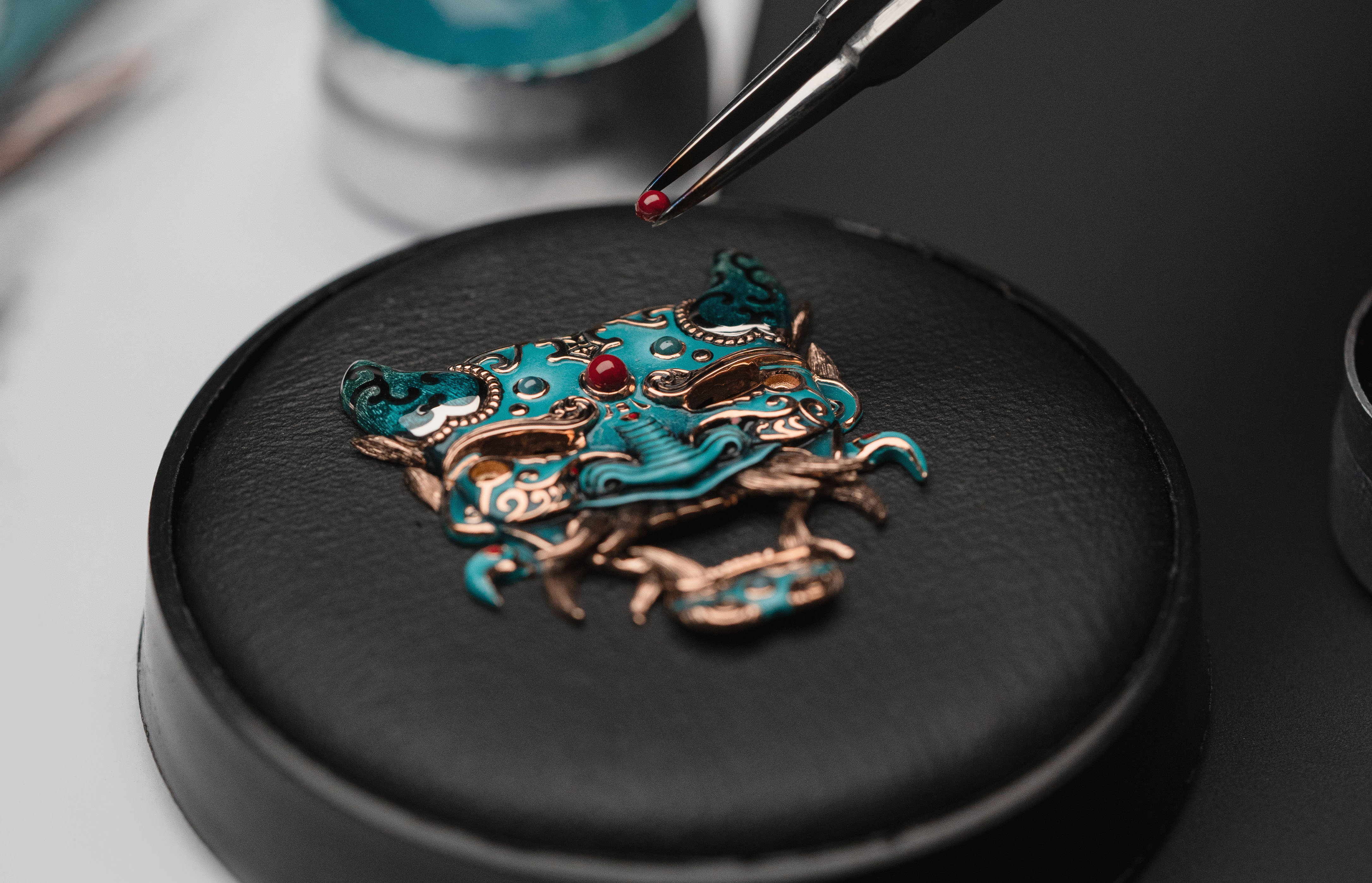 El elemento central es una microescultura en oro rojo trabajada con técnicas de grabado, pintura, esmaltado y engaste que suman más de 200 horas de labor. Los cuernos, elaborados en esmalte translúcido y los detalles en los ojos, nariz y boca en oro le dan a la máscara una presencia imponente.