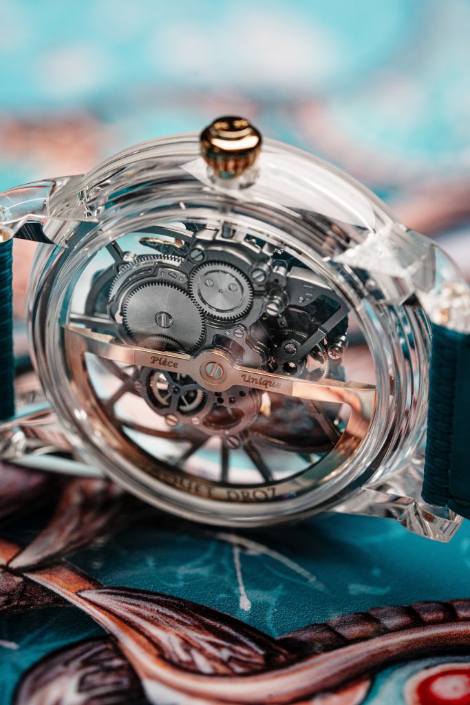 A modo de hito de diseño, no tiene tornillos e insertos, ofreciendo una visión perfecta del movimiento y de la máscara. La transparencia integral de la caja de zafiro permite contemplar la ingeniería del movimiento y la máscara como si flotara sobre la muñeca, creando una experiencia estética y simbólica inigualable.
