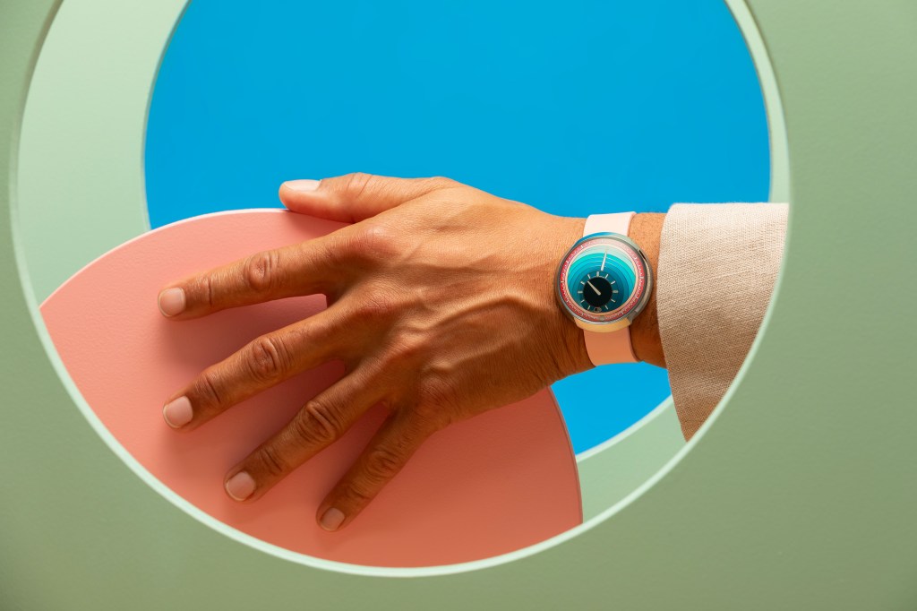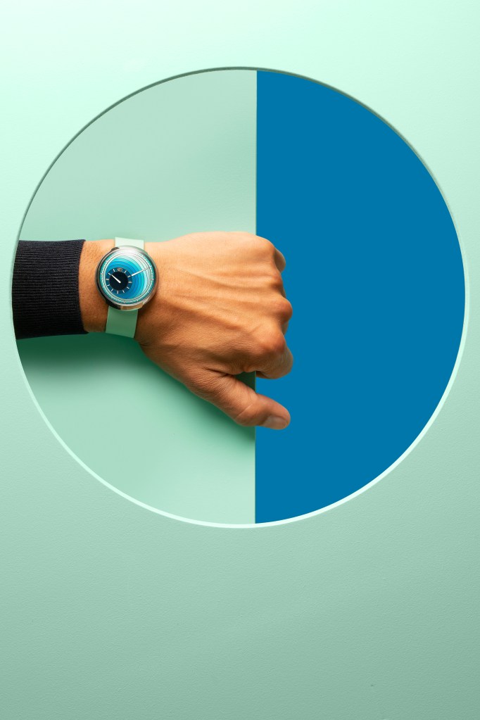 El trabajo con Daniel Engelberg parte de su serie Inside out: círculos concéntricos y relieve óptico traducidos a la esfera, donde los discos en movimiento añaden profundidad sin recargar la imagen. El objetivo es claro: leer horas y minutos de un vistazo. Aquí el color forma parte del lenguaje de lectura —no es adorno— y refuerza el carácter de cada versión.
