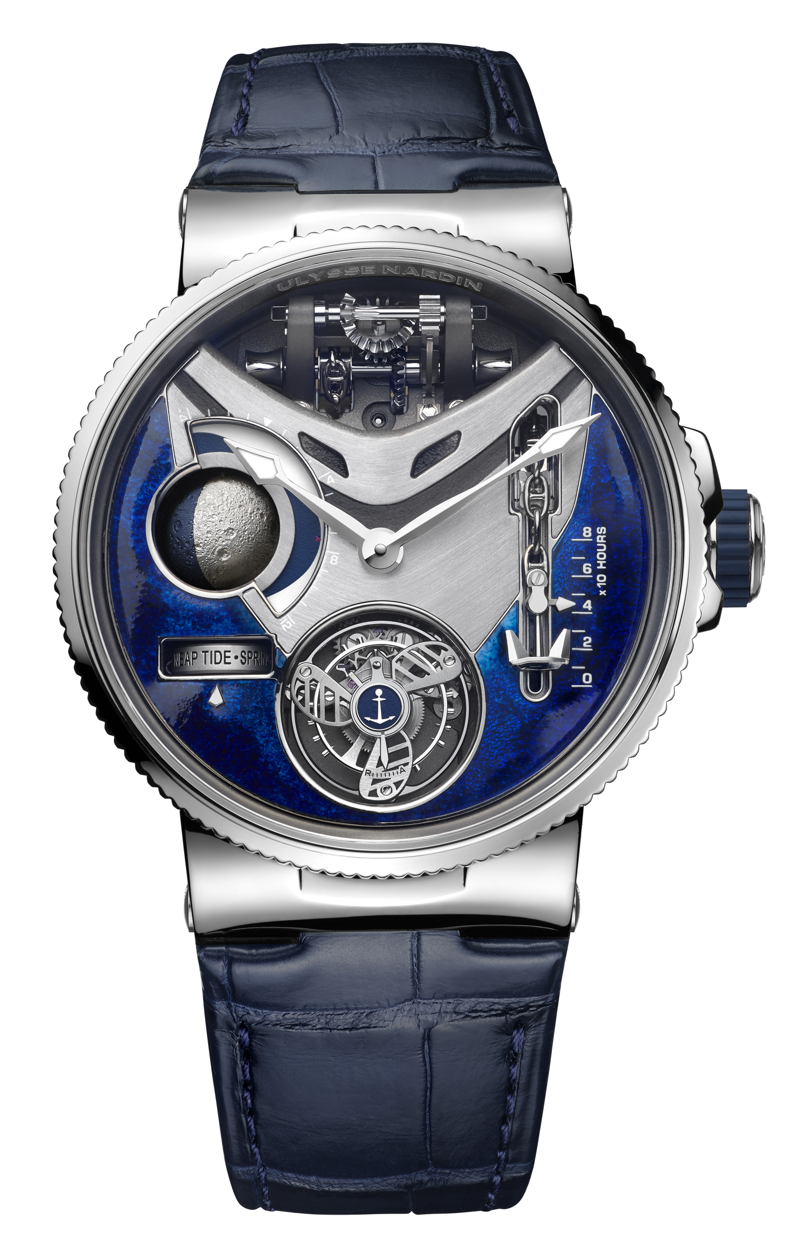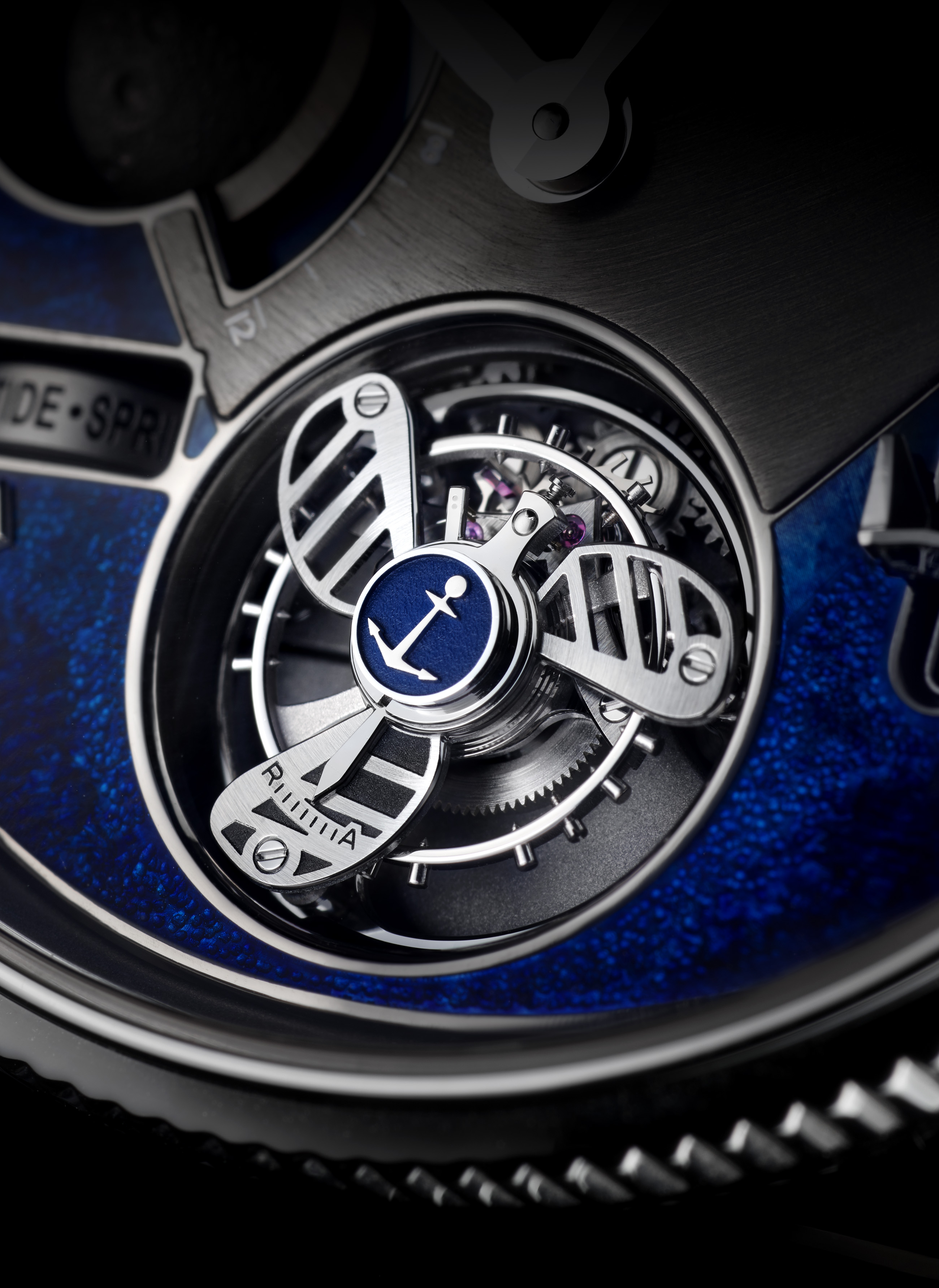 La esfera en 3D decorada con esmalte Grand Feu captura la mirada gracias a su tono azul profundo y da comienzo a lo que podríamos interpretar como el viaje exploratorio de este reloj. A simple vista se encuentra el tourbillon volante, que en un guiño a la temática ha sido dotado en una jaula que se inspira en una hélice. A esta función se le unen una representación de la luna —para controlar las fases lunares— con una superficie ultra detallada ubicada a las 9, un indicador de mareas y hasta un ancla que se iza con una cadena ubicada a las 12 y que indica la reserva de marcha. Su correa en piel, por supuesto, es también de color azul marino.opósito: uno muestra las horas y los minutos con discos de aluminio y titanio pulido; el segundo indica la reserva de marcha con visualización radial; el tercero integra un termómetro mecánico con espiral bimetálica; y, finalmente, el cuarto oculta la corona de ajuste, como una habitación vacía que esconde una sorpresa funcional.