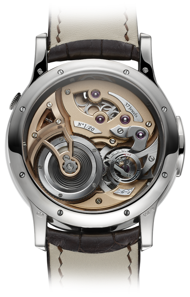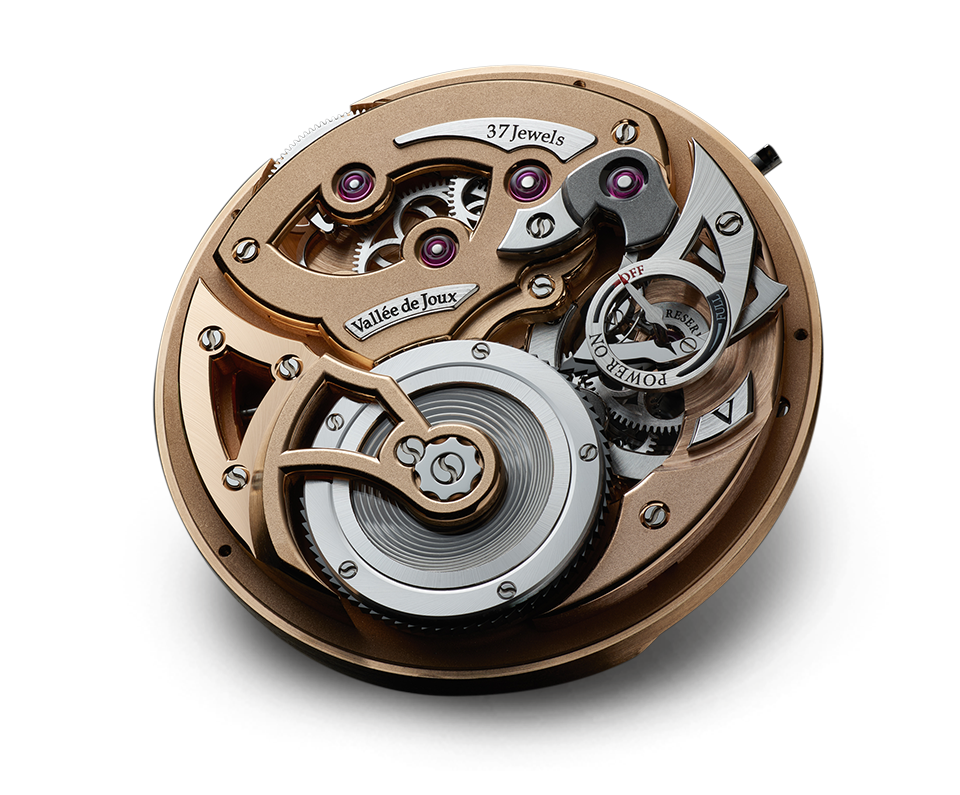 Darle la vuelta es descubrir otro universo. Puentes biselados a mano, superficies perladas, tornillos azulados y muchos detalles más nos ofrecen una lección de meticulosidad suiza llevada al extremo. No hay un solo ángulo de esta máquina que no tenga un propósito.