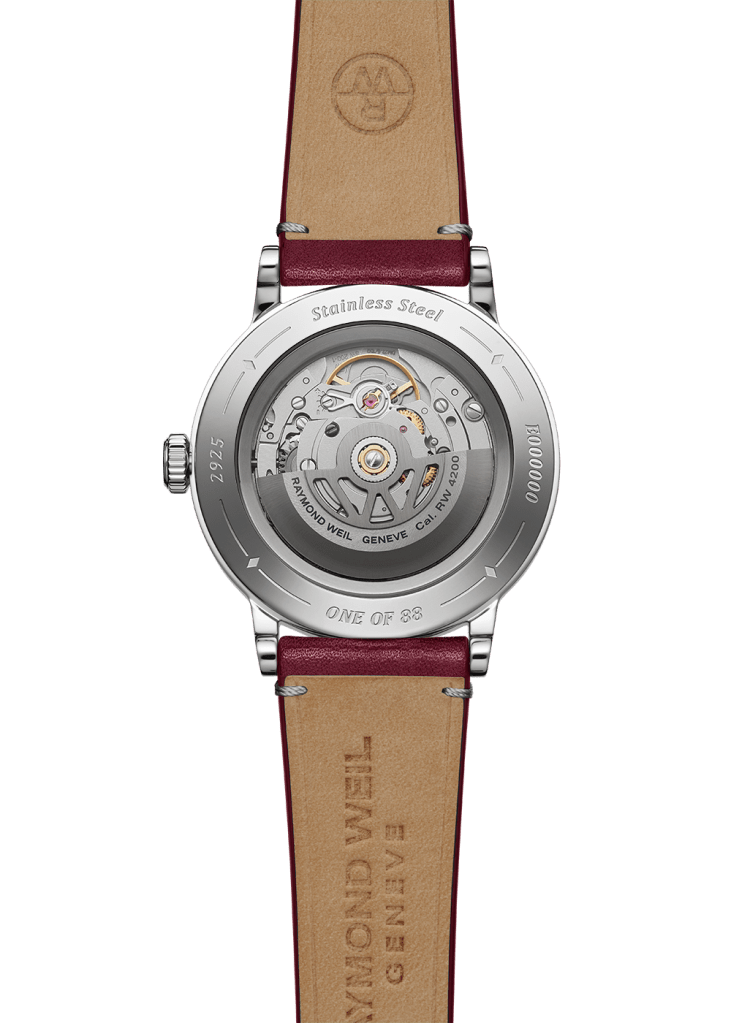 El fondo de la caja deja ver el movimiento automático, junto con la masa oscilante en forma de W: una firma distintiva de la casa Raymond Weil.