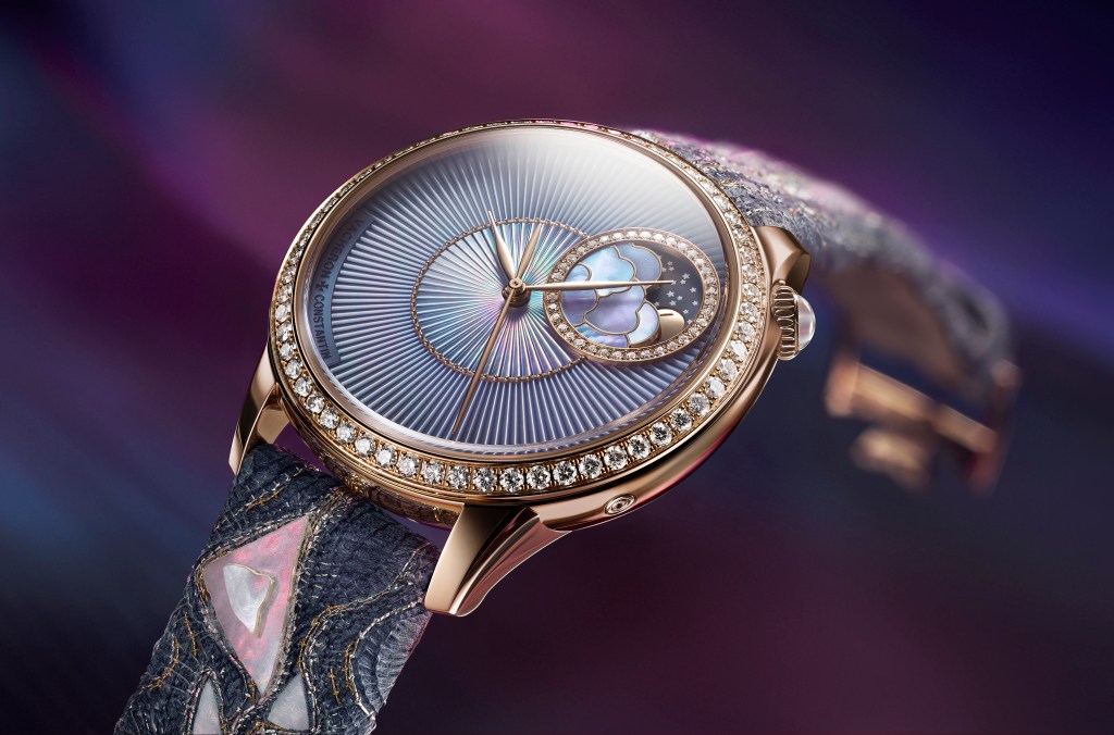 La caja, en oro rosa de 18 quilates engastada con diamantes, enmarca una esfera sin índices, sin jerarquía, sin urgencia. El tiempo aquí no se mide, se intuye. Realizada en madreperla lila, la esfera despliega un motivo plisado que evoca el ritmo de un respiro o la ondulación del agua. En su asimetría se reconoce el lenguaje estético de la colección Égérie, pero con una libertad que solo un concept watch puede permitirse.