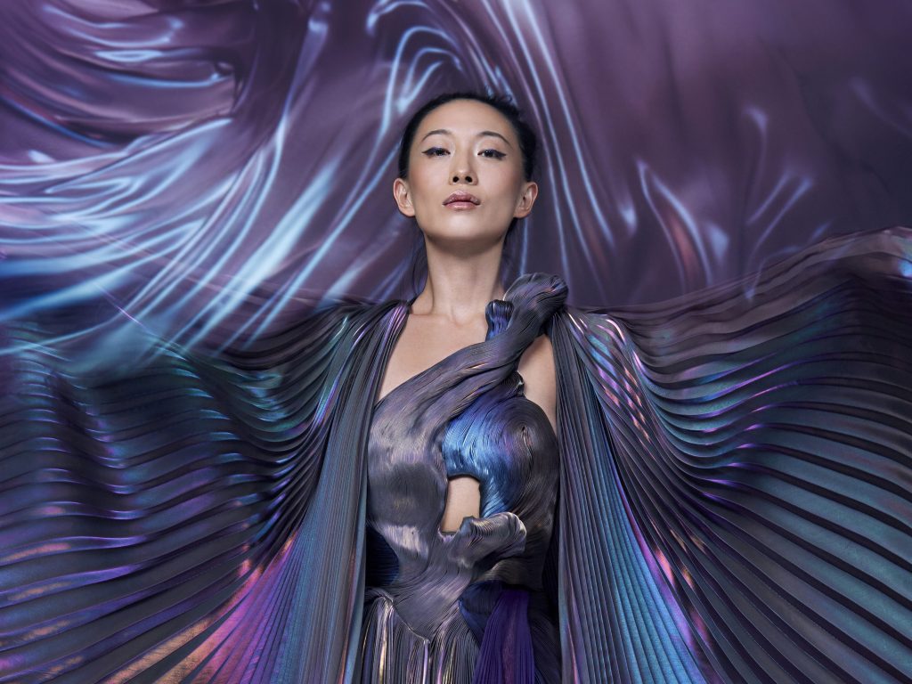 Para presentar esta pieza, Yiqing Yin no solo pensó en su diseño, sino también en cómo podría vestirse quien lo llevara. Creó un vestido de alta costura inspirado en los mismos códigos: tejidos etéreos que se enrollan como espirales infinitos en torno al cuerpo, plisados tornasolados que capturan la luz como la esfera del reloj, superposiciones de gasa y satén que sugieren un movimiento suspendido.