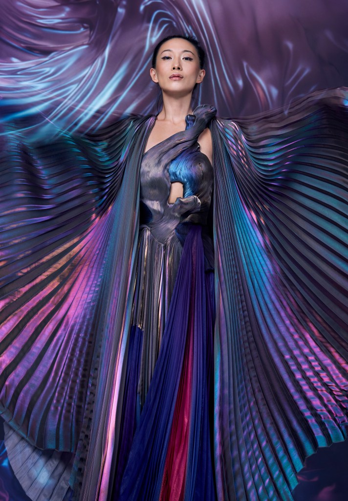Inspirado en la vitalidad de los elementos y teñido con técnicas minerales, este vestido es la manifestación visible del universo que el Égérie – The Pleats of Time propone: un tiempo que fluye, que brilla, que se diluye y muta.